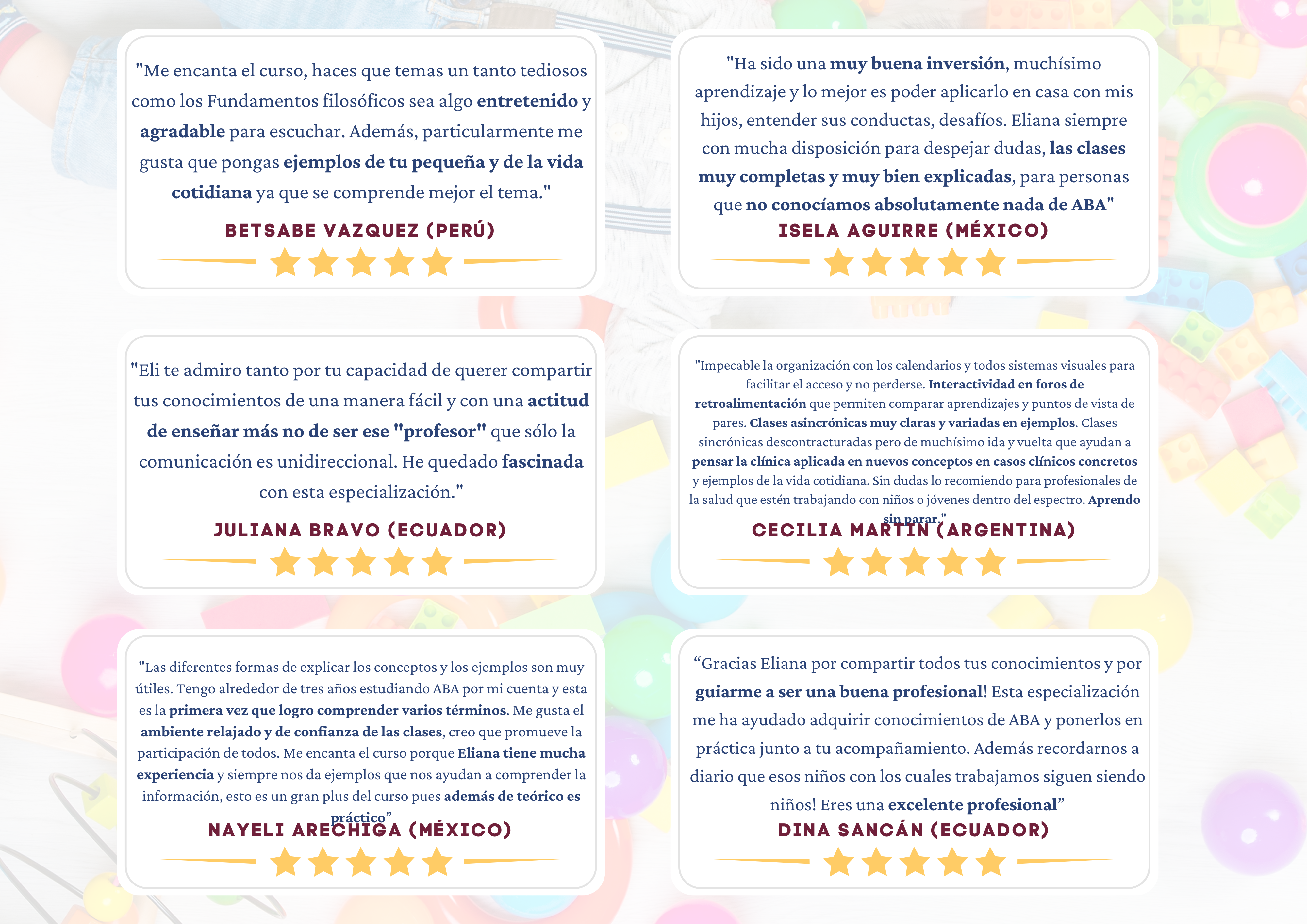 Nuestra Especialización en ABA y autismo fue diseñada con la premisa de ofrecer la mejor formación teórico-práctica disponible en español extendiendo los contenidos más allá de los requeridos por las entidades certificantes y con el objetivo de formar profesionales que sean capaces de ofrecer servicios de calidad, basados en evidencia científica pero sin perder de vista la funcionalidad de los objetivos enseñados a los niños y la naturaleza humana de la población con la que trabajamos.