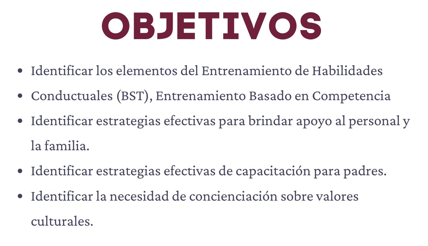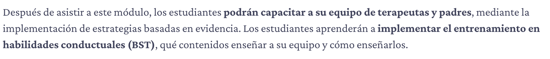 DIRIGIDO A: Profesionales de carreras de analisis del comportamiento, salud y educación interesados en capacitar personal a su cargo, terapeutas y/o padres, con fines de formación interna o para posterior adquisición de certificaciones oficiales en el campo del análisis conductual.