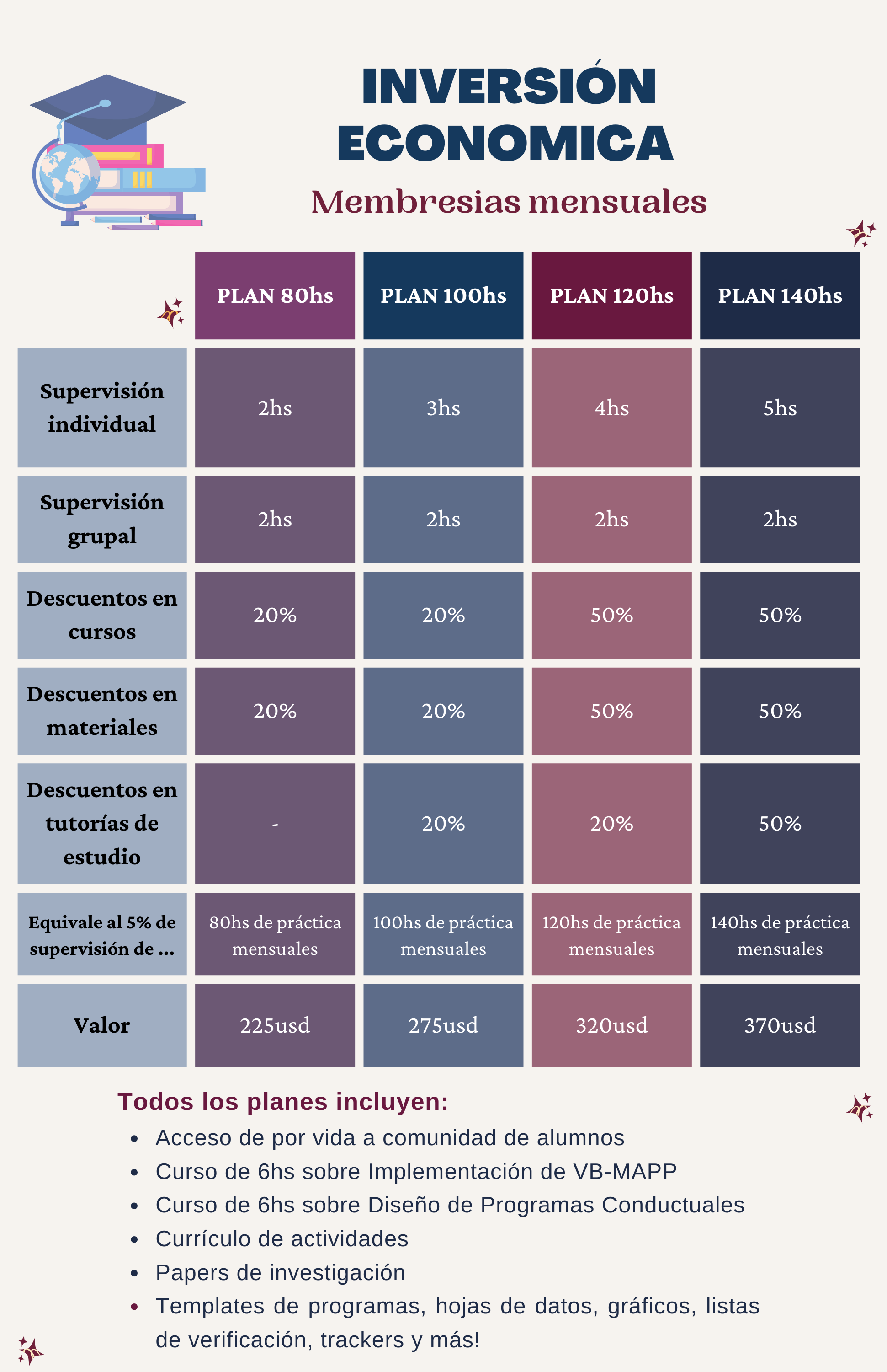 Los planes mensuales te dan acceso a el curso de VB-MAPP de 6hs de duración y el curso de diseño de programas conductuales también de 6hs de duración, y a descuentos en productos, cursos y tutorías de estudio que van del 20% al 50%