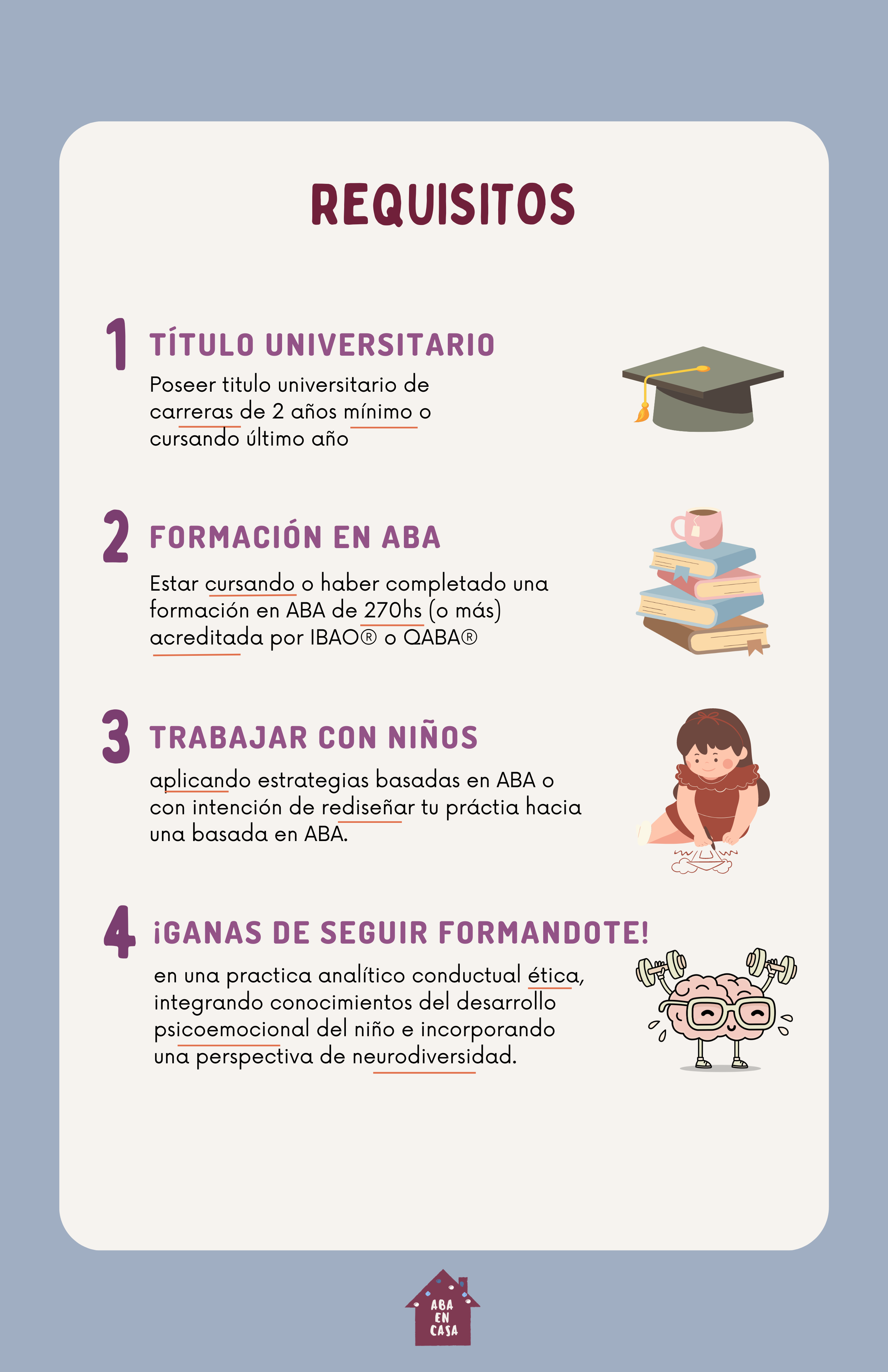 Si bien esta pensado y orientado a candidatos a estas certificaciones, todos aquellos que tengan formación en ABA de al menos 270hs pueden sumarse al programa.