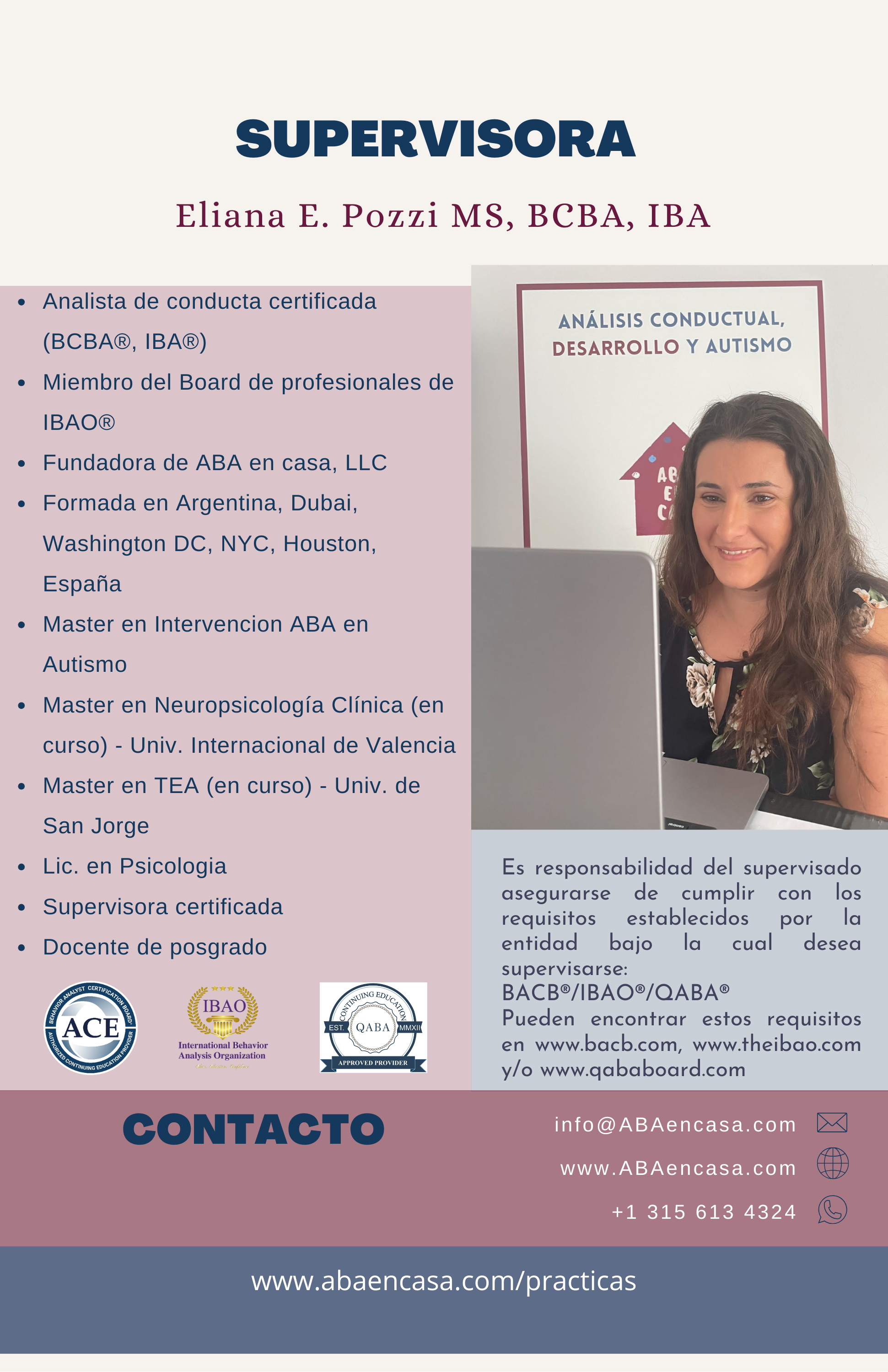 En ABA en casa serás supervisado por la fundadora Eliana E. Pozzi certificada como BCBA e IBA, y miembro de la junta de profesionales de IBAO.